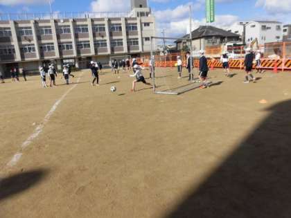 今日は1組と2組で一緒にサッカーをしています。サイドからのセンタリングのボールをナイスシュート!