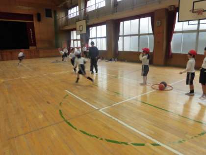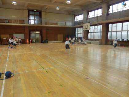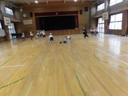 ボールを自分の陣地に運ぶゲームをしています。チーム戦なので、頭を使います。