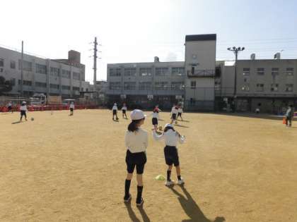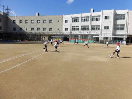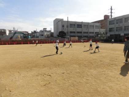 ラインサッカーをしています。今日はディフェンスをつけてドリブルをしていきます。うまく通れるかな?
