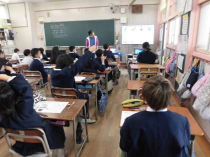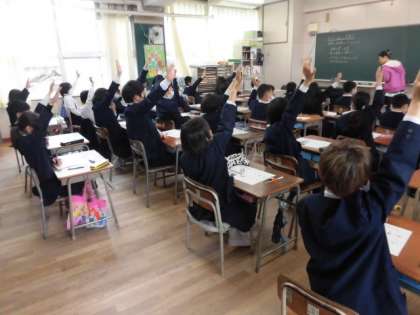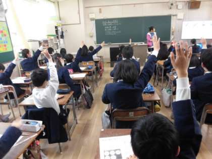 今日は栄養教諭の先生が、「おはし名人になろう」の授業をしています。食事をする時のマナー(ルール)について学んでいます。