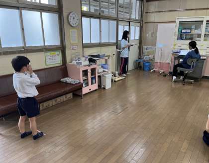 視力検査を行っています。昨日は4年生、今日は3年生を行いました。眼鏡をかけている人はかけたまま測定します。忘れないようにしてください。
