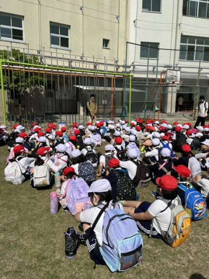 運動場で整列して元気に出発しました。
