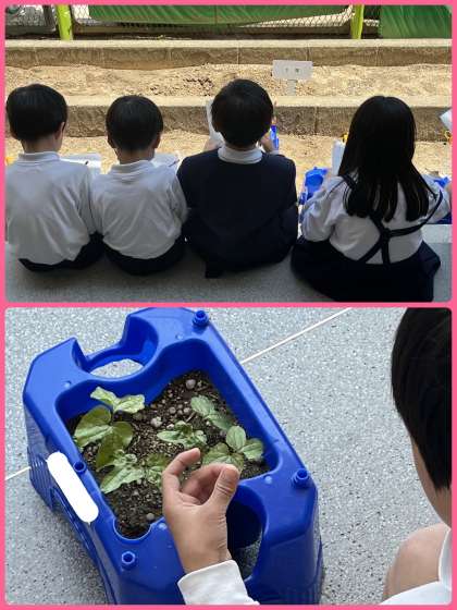 毎日の水やりのおかげで順調に芽が出てきたアサガオ。今日は4組が観察していました。かたちは?いろは?さわったかんじは?たくさんの発見があったようです。何色のアサガオの花が咲くかなぁ、楽しみですね。
