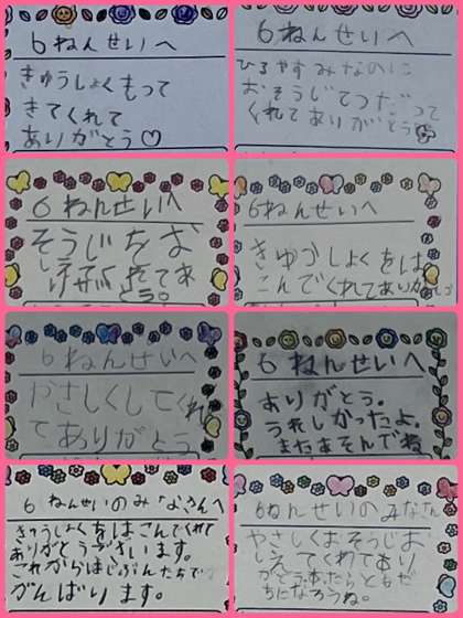 ならったばかりの「ひらがな」をかいて、6ねんせいのおにいさん、おねえさんに おてがみをかきました。おもいよ、とどけー。