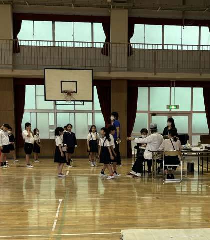 耳鼻科検診が始まりました。講堂で行います。今日は3年生4年生。静かに並んでできました。すばらしい!