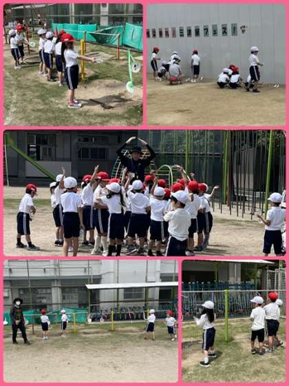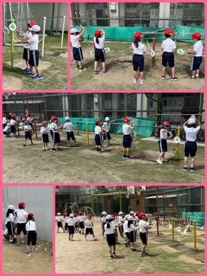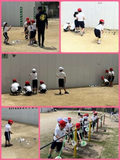 1年生1組2組3組が生活科「みずあそびをしよう」の学習に取り組みました。ペットボトルの蓋に穴を開けた水鉄砲で、自分たちが作った紙皿などを的にして、的当てを楽しんでいました。