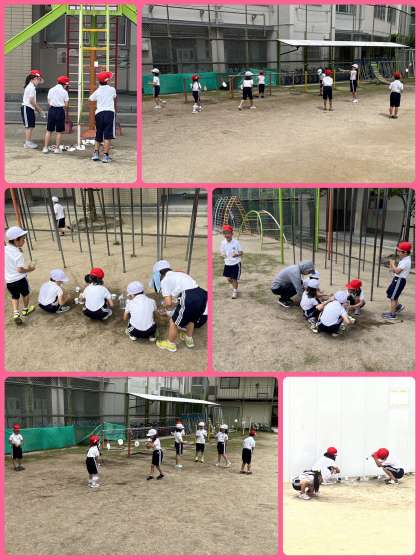 今日は1年4組!!ペットボトルの水鉄砲で的当てをしたり、地面に絵を描いたりして楽しみました。笑顔いっぱいの1年生です。
