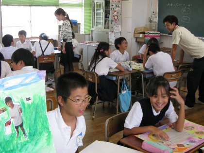 自分写真を画用紙にはり、その周りにいろいろいな写真をはりました。画用紙の白いところに絵具で図やもようを描きました。それぞれの思いがつまった作品です。