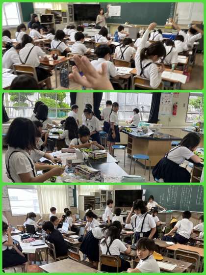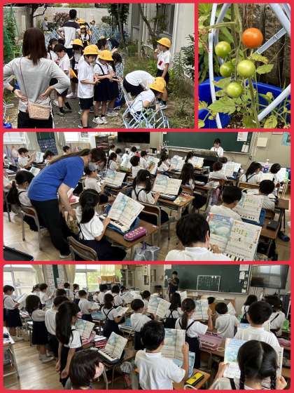 2年1組はミニトマトの観察&虫探しに。毎日水やりをがんばっているミニトマト。少しずつ大きくなり、実もつけ始めています。