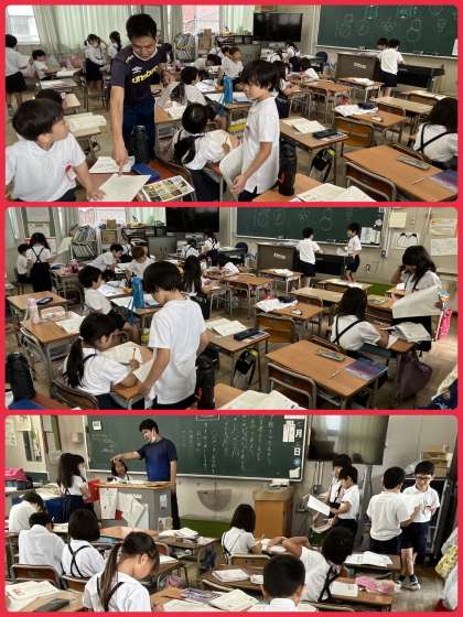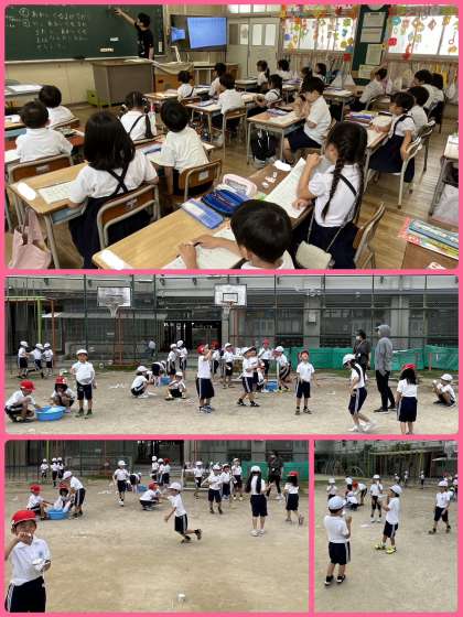 今日は1年4組が生活科の時間に,ストローやうちわを使ったシャボン玉遊び。「みてー、みてー」と笑顔いっぱい、楽しそうに取り組んでいました。