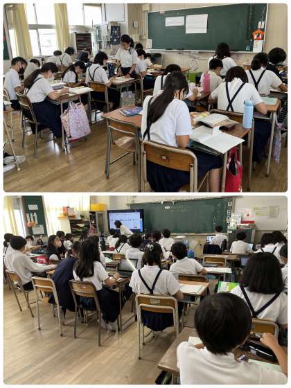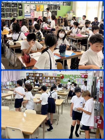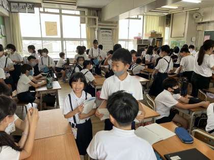 6年2組の教室に5年2組のみなさんが。何やら交流があったようです。縦割り班だけでなく、異学年で学び合うことも学校としては大事にしていきたいと考えています。どんどん学びの輪を広げていきましょう。