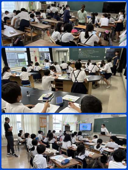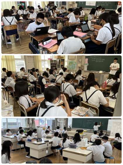 6年3組家庭科の学習。エプロンづくりに取り組んでいます。グループで協力しながら、完成までゆっくりていねいに進めてほしいと思います。