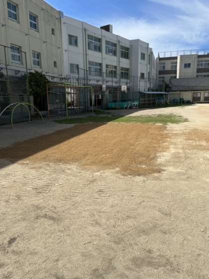 このまま1年は我慢が続く運動場。子どもたちが少しでもケガなく目一杯体を動かせるように砂場だった部分を無くしました。体育の学習、休み時間、施設開放での野球などの取り組みでも、できることが増えたらうれしいです。子どもたちの笑顔が増えたらさらにうれしいです。
