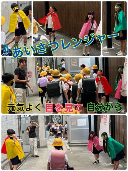 先週の金曜日、各クラスに代表委員のみなさんからお話のあった「あいさつレンジャー」。ほんとうに来てくれるのか…。そして迎えた今日。本当にやってきてくれました!!あいさつレンジャーのほかにも、「元気よく」「目を見て」「自分から」のうちわを持った代表委員のみなさんが!