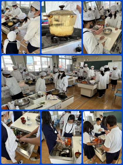 5年1組は家庭科の調理実習。ごはんとおみそしるを作っていました。電気炊飯器ではなく、自分たちで火の加減を調節して炊き上げます。林間学習でも取り組んだ炊飯。今日の出来はどうだったかな?後片付けもみんなで。感心です。