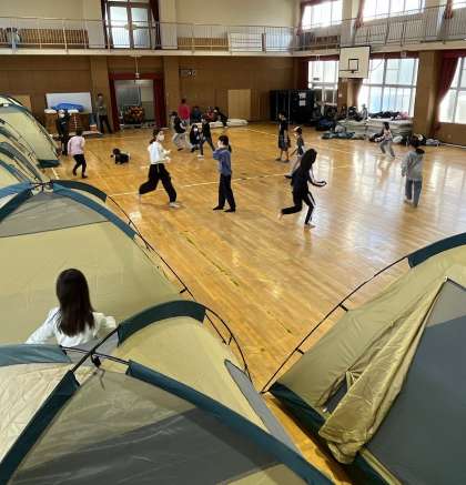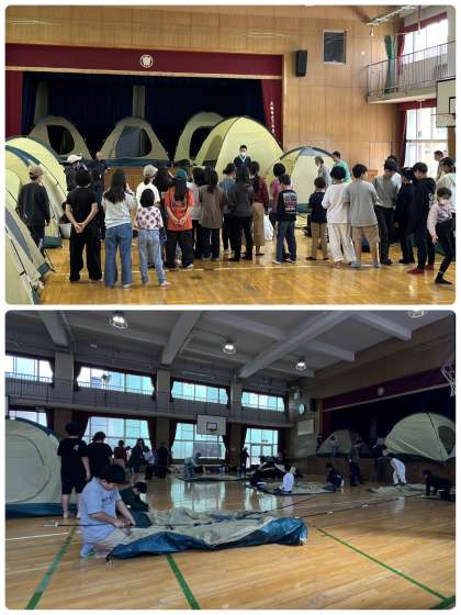 雨のため講堂に張ったテントの片付け。最後まで自分たちの手で。午後には防災体験も。
