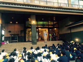 〇 宿に到着しました。開舎式でホテルの方の注意を聞いています。部屋から海が見えます。すごくいいホテルです。