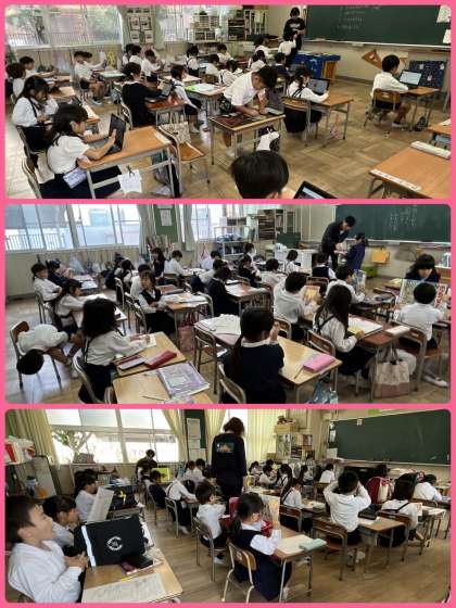 1年3組は講堂で平均台を使って、2年1組3組は運動場で鉄棒を使っての体育の学習。全身を目いっぱい動かして取り組んでいました。