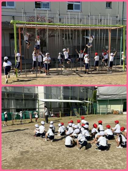1年3組4組は運動場でのぼり棒と鉄棒を使っての体育の学習。穏やかな日差しの中、懸命に全身を動かして取り組んでいました。すばらしい!