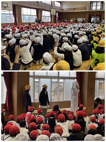 ちょうど1週間前に行った全校オリエンテーリング。今日はその表彰式。特別ゲストに仙人とガールズも来てくれました。