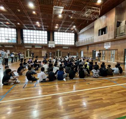 人権ネット主催の「第30回 子どもスポーツ交流会」が美津島中学校で開催されました。三津屋小学校とお隣の加島小学校の5年生と6年生が合同チームを組んでドッジボールのリーグ戦を行いました。