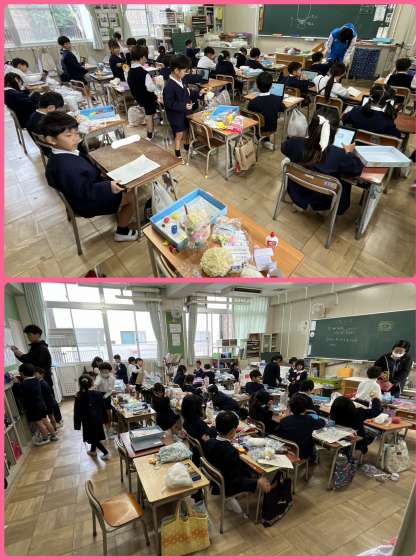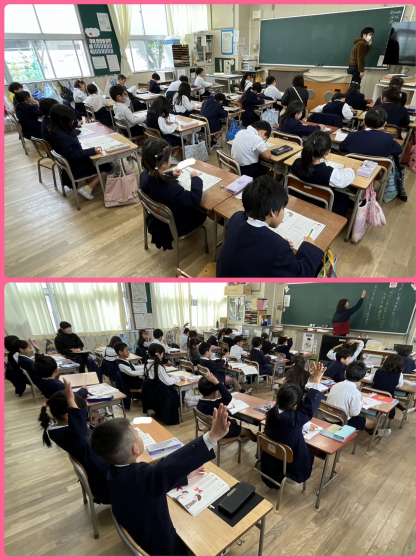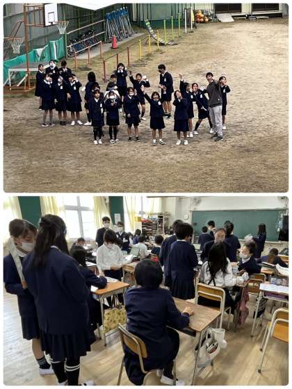 6年2組の写真は記念撮影ではありません。算数「図形の拡大と縮小」の学習、縮図を利用して校舎の高さを求めているところです。2階にいた私と目が合ってしまい、ピースしてます。