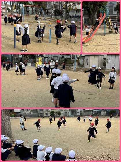 今日のお昼休みは、1年3組が公園へ。クラスのみんなで遊具遊びするのもやっぱり楽しい!鬼ごっこにドッヂビー、大縄でも遊びました。