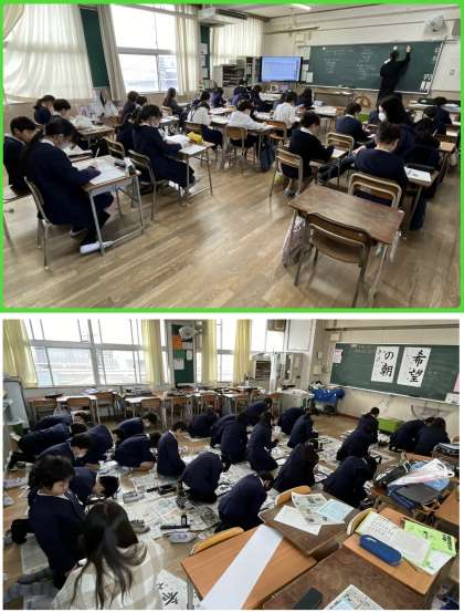 6年1組は書き初め「希望の朝」。新年の新たな気持ちで挑んでいたようです。2組、3組も取り組みました。