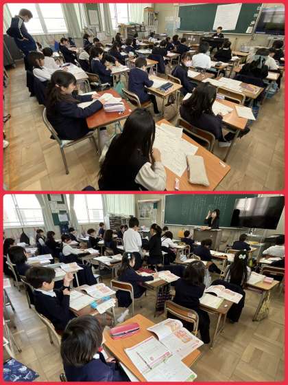 3年3組算数の学習。二等辺三角形と正三角形の辺については学習しましたが、今日はそれぞれの三角形の角のちがいについて考えていました。色紙で作った三角形を切ったり、折ったりして、自分で考え、それを伝え合っていました。二等辺三角形と正三角形の辺と角、それぞれの特徴を復習しておいてくださいね。