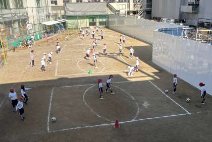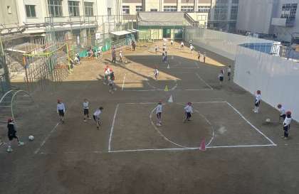 2年生の体育の学習は「ボール蹴りゲーム」。どのクラスも楽しく張り切って取り組んでいました。