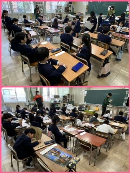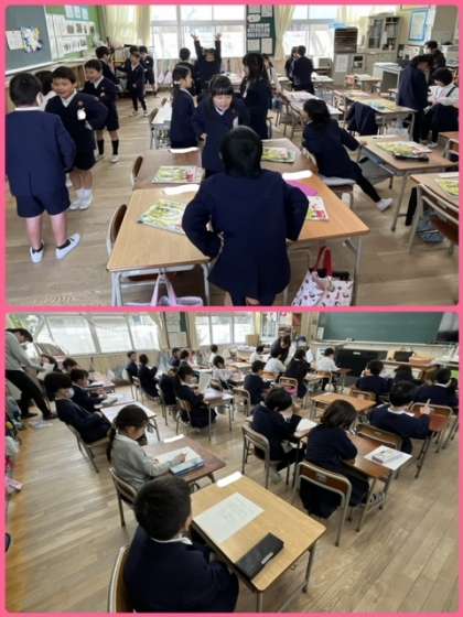 1年3組は音楽「おちゃらかほい」。「おちゃらかかったよ、おちゃらかほい」ペアになってリズムに合わせて取り組んでいました。勝っても負けてもあいこでも、楽しそうな子どもたちです。