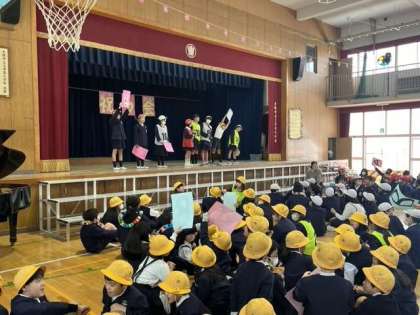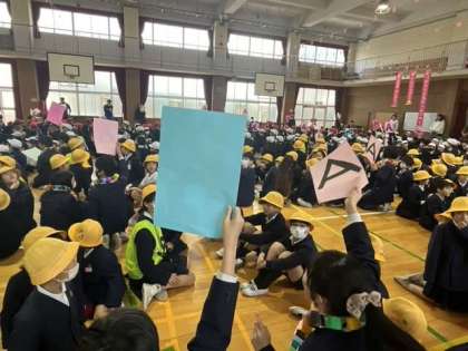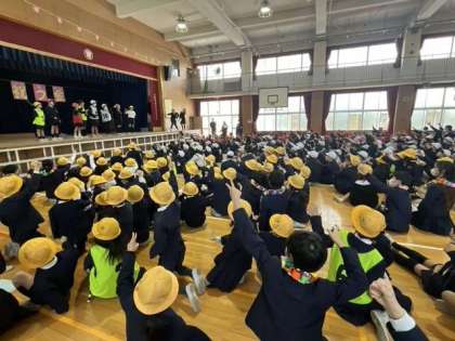 最後はもちろん集会じゃんけん!勝っても負けてもあいこでも、6年生とふれあいが。よく考えられています。