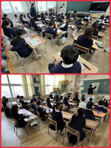 2年3組国語の学習は『書き方』。水書板を使って毛筆の練習に取り組んでいました。すぐに乾くので何度も練習できるところが水書板のいいところです。筆を立ててていねいに取り組めたようです。ノートもていねいに取り組んでいきましょう。