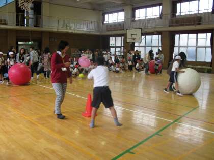 PTA主催の行事ファミリーフェスティバルが行われました。この日は3年生と5年生です。3年生は大玉とラケットを使ったリレー。5年生はしっぽ取りを行いました。親子、先生もみんなで楽しくゲームを楽しみました。
