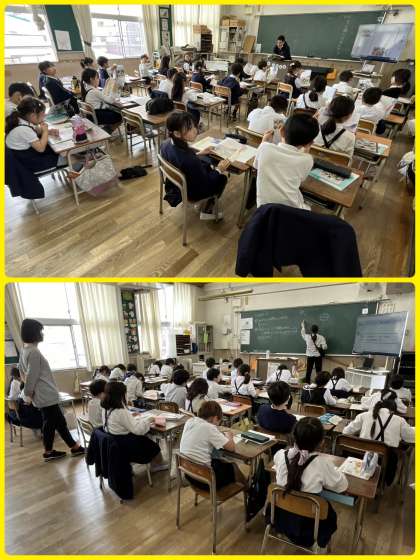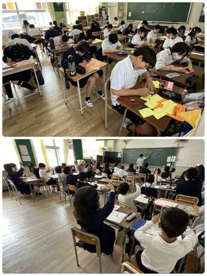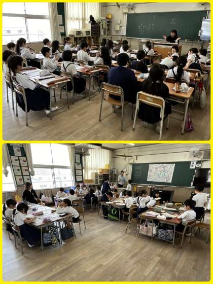3年2組社会の学習。先日行った校区たんけんで見たことや気づいたことをまとめていました。発表に向けて協力しながら進めてほしいです。