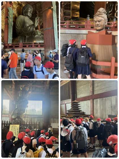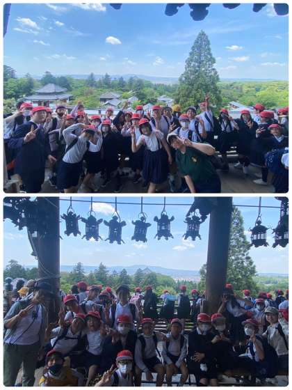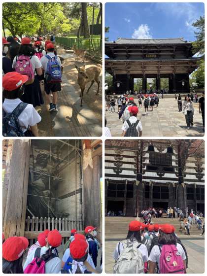 6年生にとって小学校生活最後の春の遠足に行ってきました。たくさんの観光客の方がいて鹿せんべいを求めて歩道まで鹿がいっぱい。たくさんの鹿に出迎えられて遠足がスタートしました。