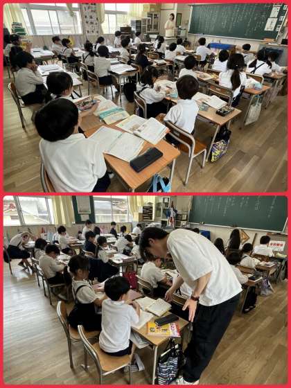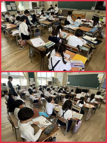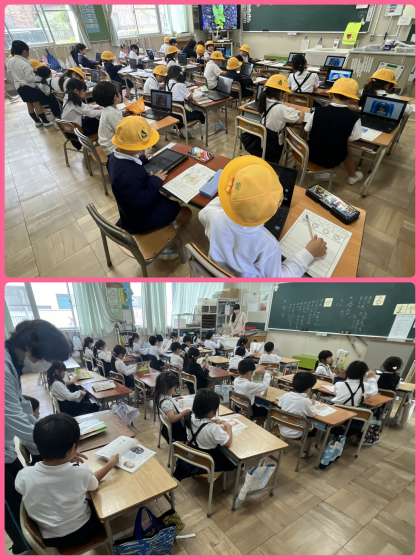 1年1組生活科の学習はあさがおの観察。一人一台のタブレット端末で自分の植木鉢の写真を撮影し、その写真を見ながら観察カードにあさがおの絵やようすをかいていました。こないだ種を蒔いたなぁと思っていましたが、いつのまにかたくさんの芽が。これからどうなるか楽しみですね。