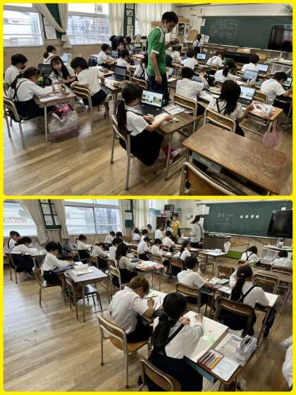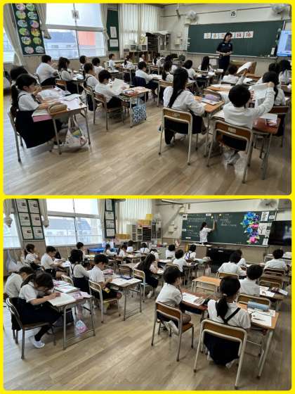 「きゃー」「わー」講堂からにぎやかな声が聞こえるなぁと思って見に行くと、1年生4クラスでじゃんけん列車をしていました。とても長い列車ができました。