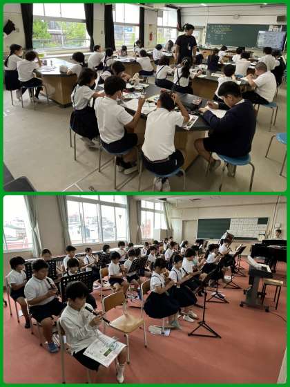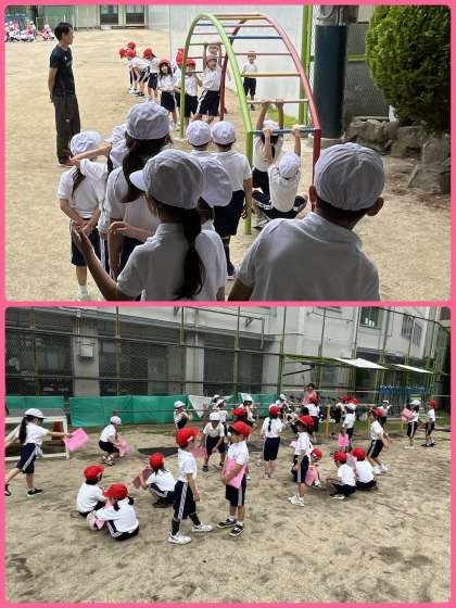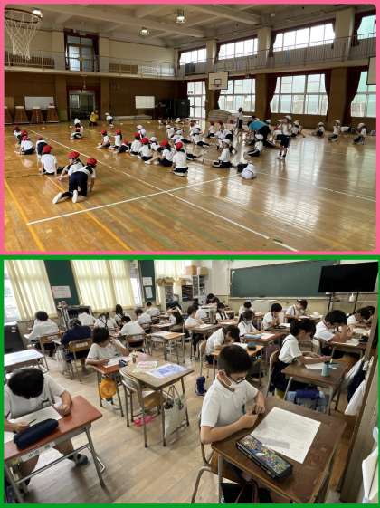 3時間目は1年生体育スペシャル!1・2組は講堂で、3・4組は運動場で元気いっぱい体を動かしていました。まとわりつく蒸し暑さでしたが、子どもたちがんばっていました。蒸し暑い日が続きます。水筒と、ハンカチとは別に汗拭きタオルを持たせてください。よろしくお願いします。