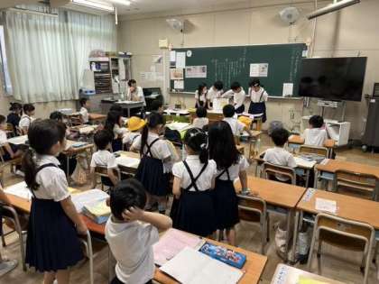 三津屋読書週間。読書週間最後の図書委員会のみなさんによる読み聞かせがありました。本の世界に入る1年1組3組4組のみなさんです。