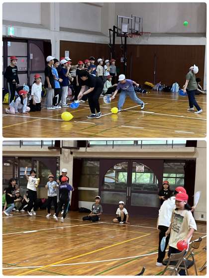 第一種目「風船ぱたぱたレース」。風船をふくらませ、うちわでぱたぱたして動かし、最後はイスの上に乗せてお尻で割ったらゴールとなります。白熱した闘いとなりました。