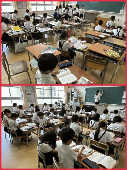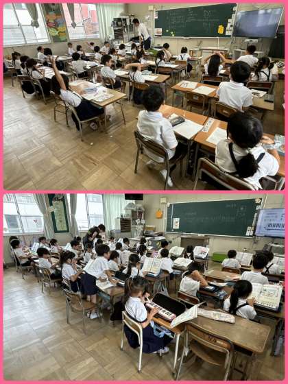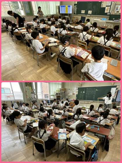 1年2組算数は「どちらがながい」の学習。紙テープを使ってながさくらべをしていました。こういった長さの比較の活動を通して、長さや測定の知識や長さの感覚を学んでいきます。とても大切な学習です。