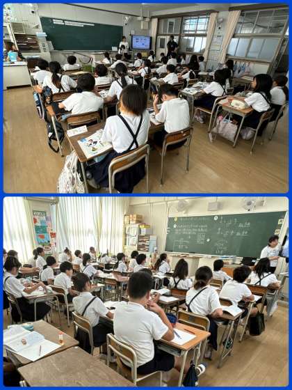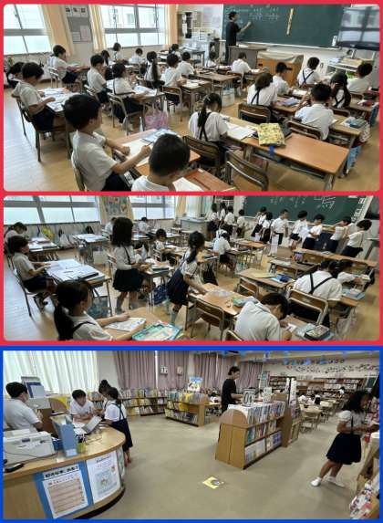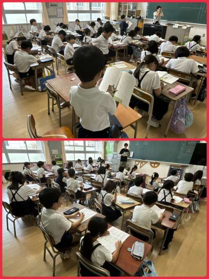 5年3組算数は「分数と小数、整数の関係を調べよう」の学習。「分数を使った倍の表し方を考えよう」をめあてに取り組んでいました。4mは5mの何倍にあたるか、この単元だけでなくこれからの学習にもつながっていきます。焦らずじっくり考えていきましょう。