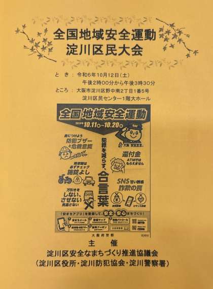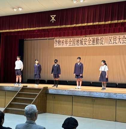 全国地域安全運動淀川区民大会が淀川区民センター大ホールで行われました。区内小学校を代表して本校の6年生5名が「安全宣言」を堂々と舞台上から宣言し、大きな拍手をもらいました。修学旅行の疲れもあったと思いますが、よくがんばりました!