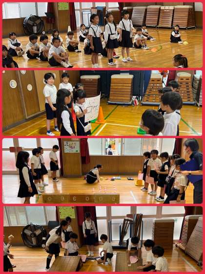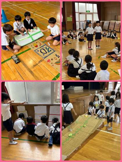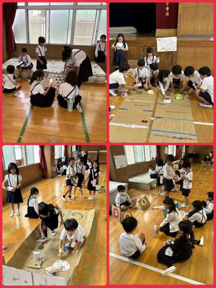 2年生が1年生を招待して『おもちゃランド』が開催されました。ぴょんコップ、とことこぐるま、ぱっちんジャンプ、ころころころりん、ロケットポン、ヨットカー。今日までコツコツと準備して取り組んできた2年生。1年生の笑顔を見られてうれしかったと思います。よくがんばりました!