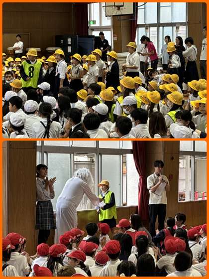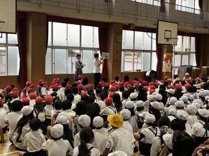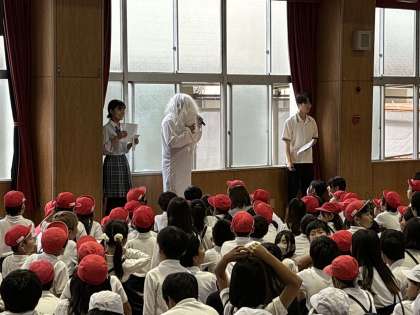 昨日の全校オリエンテーリングの熱も冷めないうちに、今日の集会は全校オリエンテーリング表彰式。三津屋のおにいさん、おねえさんからのクイズポイントの答え合わせ。「よっし!」