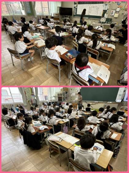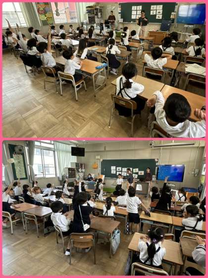 1年3組4組はC-NETの先生、英語担当の先生と『イングリッシュタイム』。めったにない学習に子どもたちもいつも以上に楽しそう、そしてハイテンション!いきいきと取り組んでいました。