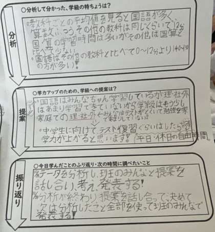 5時間目、6年3組の算数の学習を全教員で参観しました。単元名は「データを使って生活を見直そう」。曜日別や教科別の家庭学習の時間のデータをもとに、学力アップにつなげる『6年3組学力アップ大作戦』。計画から分類・整理して、分析、そして学力アップのための学級への提案を行います。さすが6年生。グループで協力しながら分析し、さまざまな提案を考えていました。なるか、学力アップ!3組のみなさん、楽しみにしておきます。
