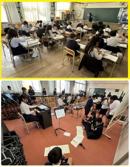 何やら楽しげなメロディーが音楽室から聞こえてきます。のぞくと6年1組のみなさんでした。一人一人が担当の楽器をリズミカルに演奏していました。完成を楽しみにしています。