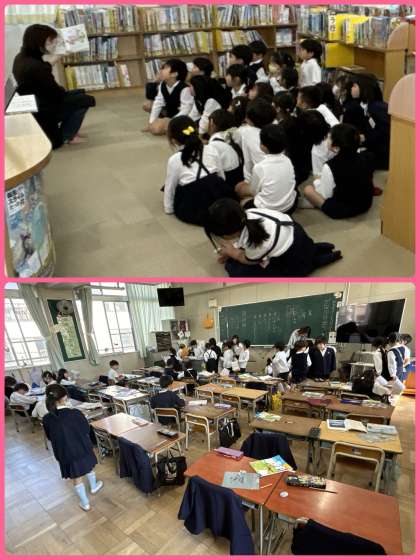 今日木曜日は図書館司書の方が来られる日。1年3組のみなさんに読み聞かせをしていただきました。私の気配も感じず、本の世界に入り込んでいる3組のみなさんです。どんなお話だったか、おうちの人にも教えてあげてね。